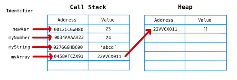 - myArray์ ๋ฐ์ด์ฒ ์์ฒด๋ ๋ณ๋์ ๋ฉ๋ชจ๋ฆฌ ๊ณต๊ฐ(Heap)์ ์ ์ฅ๋๋ฉฐ, ๋ณ์์ ํ ๋น ์ ๋ฐ์ดํฐ์ ๋ํ ์ฃผ์(ํ ๋ฉ๋ชจ๋ฆฌ ์ฃผ์ ๊ฐ)์ด ์ ์ฅ๋๊ธฐ ๋๋ฌธ์ ์๋ฐ์คํฌ๋ฆฝํธ ์์ง์ด ๋ณ์๊ฐ ๊ฐ์ง๊ณ ์๋ ๋ฉ๋ชจ๋ฆฌ ์ฃผ์๋ฅผ ์ด์ฉํด์ ๋ณ์์ ๊ฐ์ ์ ๊ทผ